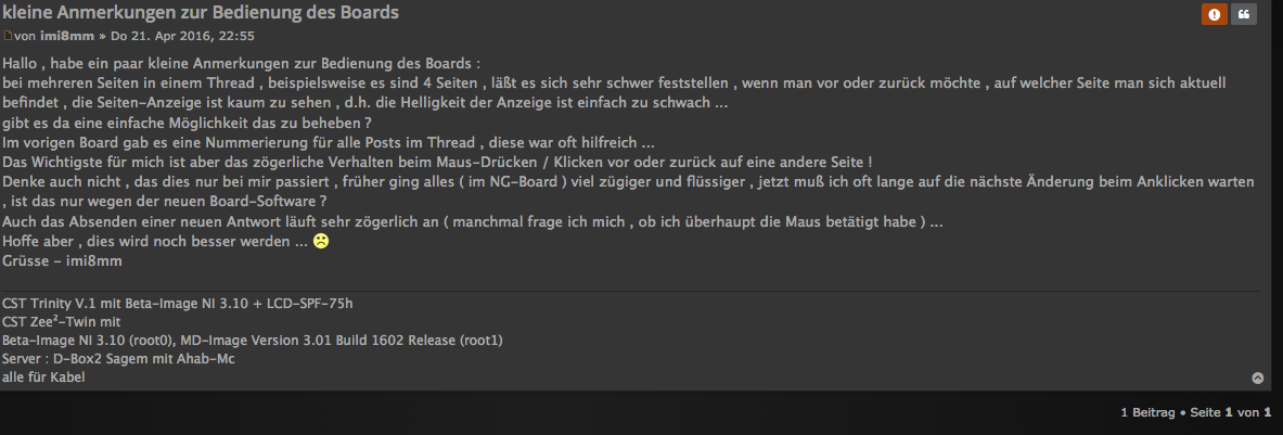 bei mehreren Seiten in einem Thread , beispielsweise es sind 4 Seiten , läßt es sich sehr schwer feststellen , wenn man vor oder zurück möchte , auf welcher Seite man sich aktuell befindet , die Seiten-Anzeige ist kaum zu sehen , d.h. die Helligkeit der Anzeige ist einfach zu schwach ...