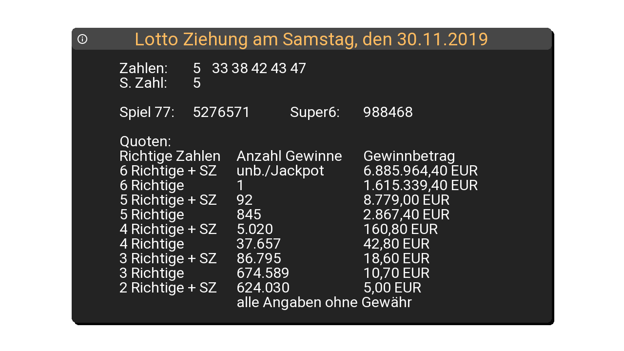 Hast Du oder vllt. noch jemand anderes vom ehemaligen Flexmenü das Lottozahlen Plugin und könnte mir dieses zur Verfügung stellen, da das meinige bei mir mit der ganzen Umstellerei von Nevis auf HD2 verlorengegangen ist.....