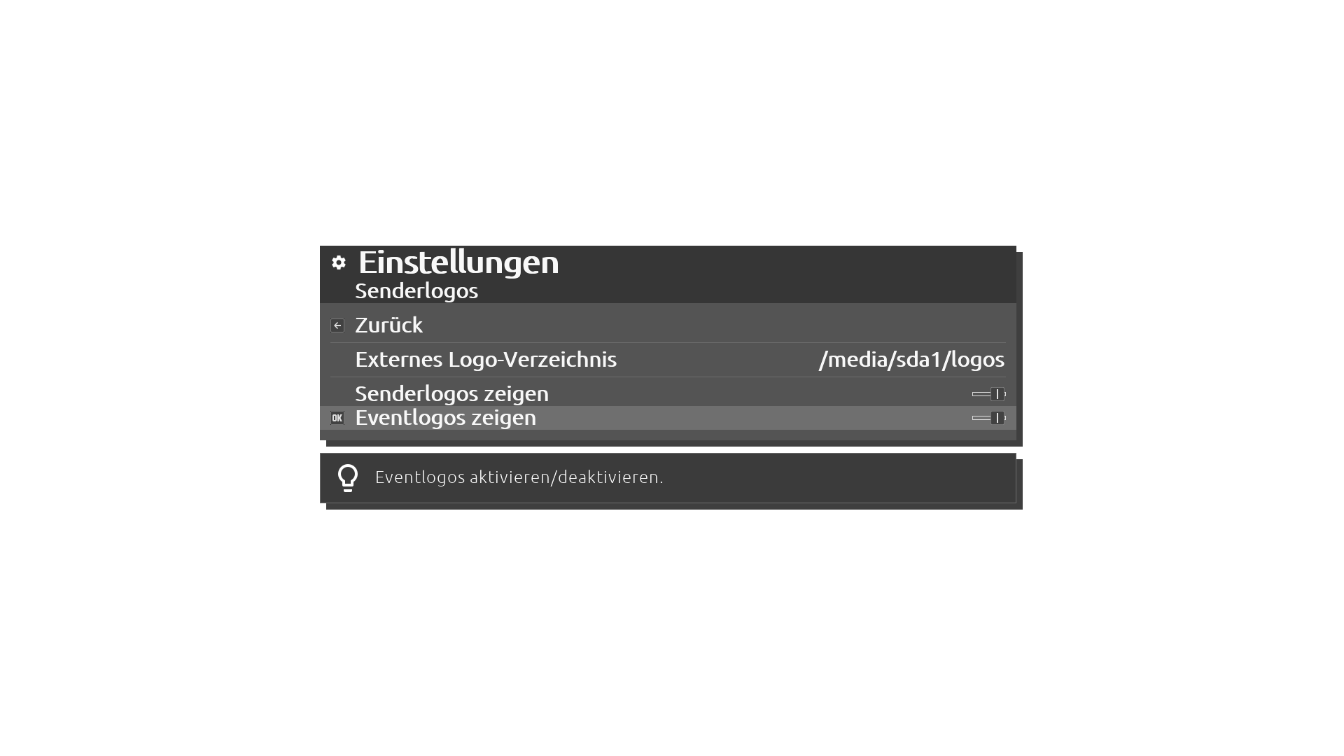 Die Eventlogos befinden sich in den bekannten Logo-Verzeichnissen in einem Unterverzeichnis "/events". Mitgeliefert wird erstmal nur "tagesschau.png". Dieses Logo wird immer dann gezeigt, wenn die Tagesschau läuft.