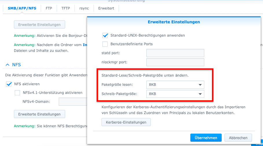 - Paketgröße für NFS auf der Synology jeweils auf 32kb angepasst