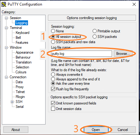 Unter Categorie "logging" auswählen, "All session Output" auswählen, Pfad zum Logfile einstellen.