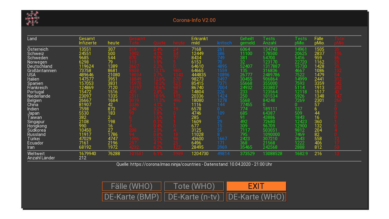 Re: [Plugin] Corona-Info V2.00: Übersicht Fallzahlen Länder