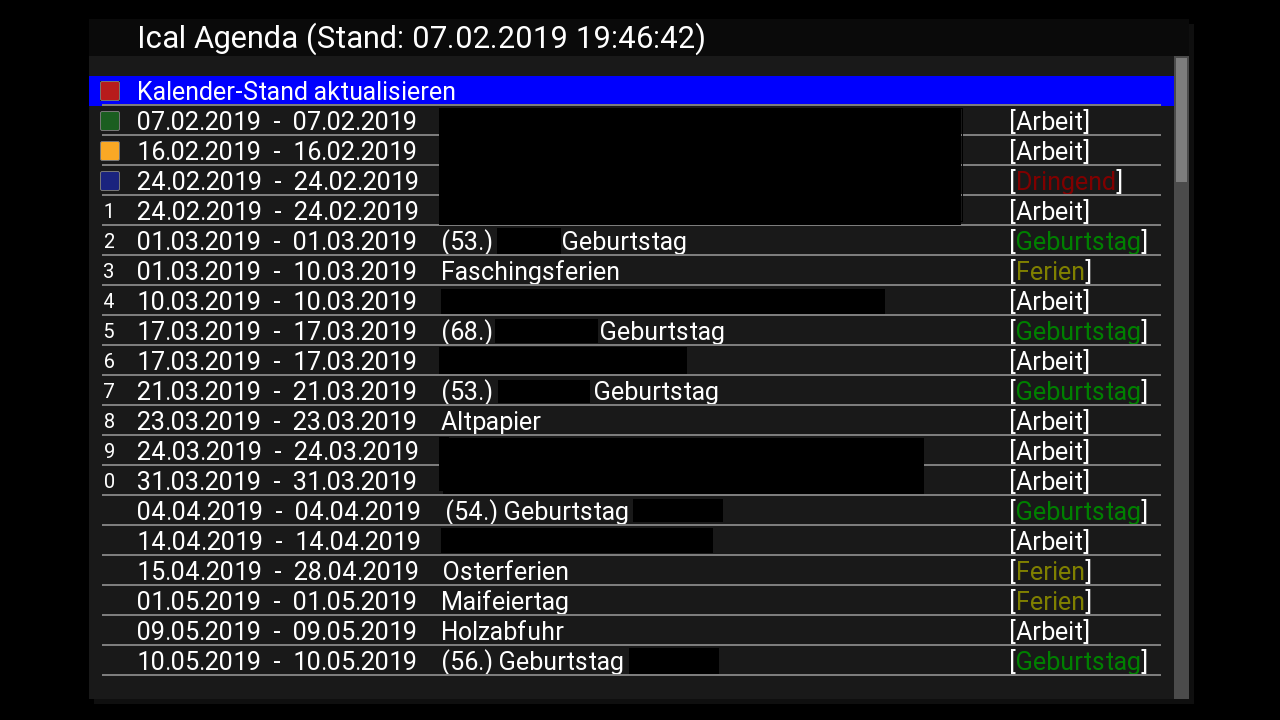 Ja, dein aktuelles Agendascript hatte ich getestet, das hat recht gut funktioniert nur gab es keinen Import in Tuxcal und auch kein Notify. Im von BPanther&fritz adaptierten iCal2Tuxcal würde jetzt wunderbar der online-Abgleich von mehreren Google-Calendern und Tuxcal funktionieren inkl Notify. Anzeige klappt in Tuxcal...nur gibt es noch keine SED-Zeilen für Termine MIT (Beginn-)Uhrzeit.