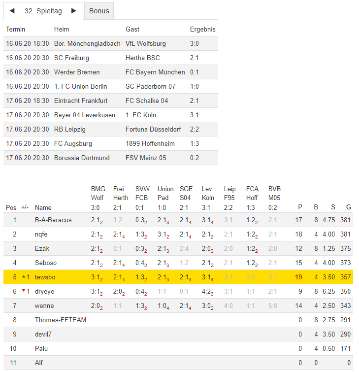 Stand 32. Spieltag - NI-Tippspiel zur Bundesligasaison 2019/20