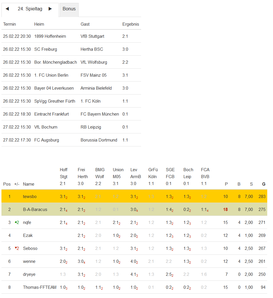 Stand 24. Spieltag - NI-Tippspiel zur Fussball-Bundesligasaison 2021/22