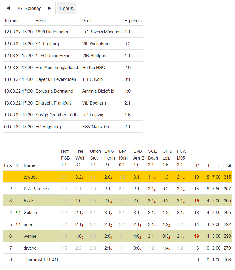 Stand 26. Spieltag - NI-Tippspiel zur Fussball-Bundesligasaison 2021/22