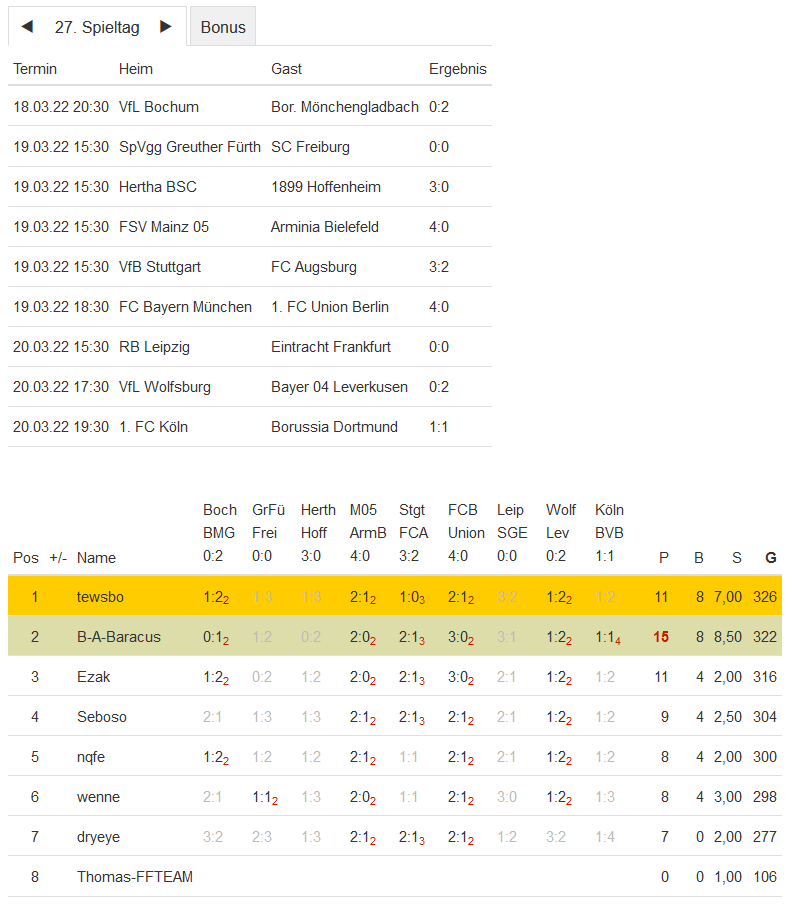 Stand 27. Spieltag - NI-Tippspiel zur Fussball-Bundesligasaison 2021/22