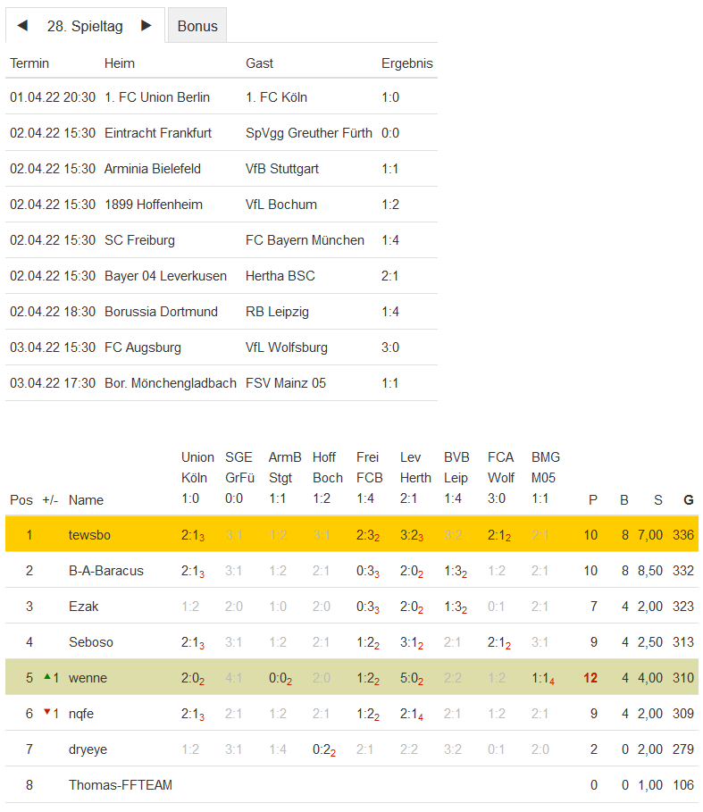 Stand 28. Spieltag - NI-Tippspiel zur Fussball-Bundesligasaison 2021/22