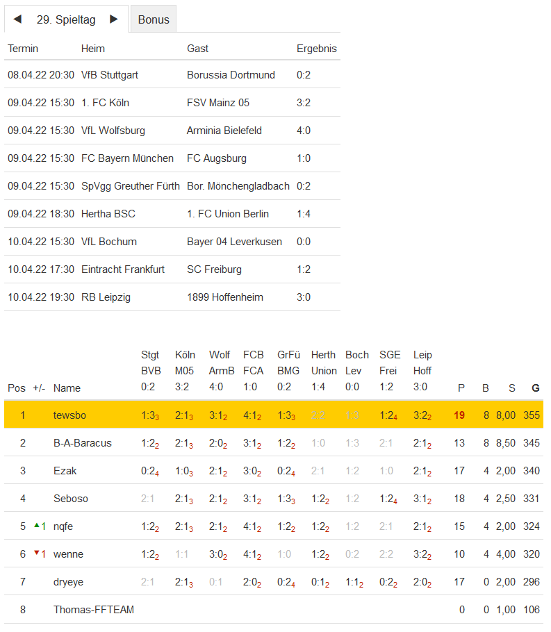 Stand 29. Spieltag - NI-Tippspiel zur Fussball-Bundesligasaison 2021/22