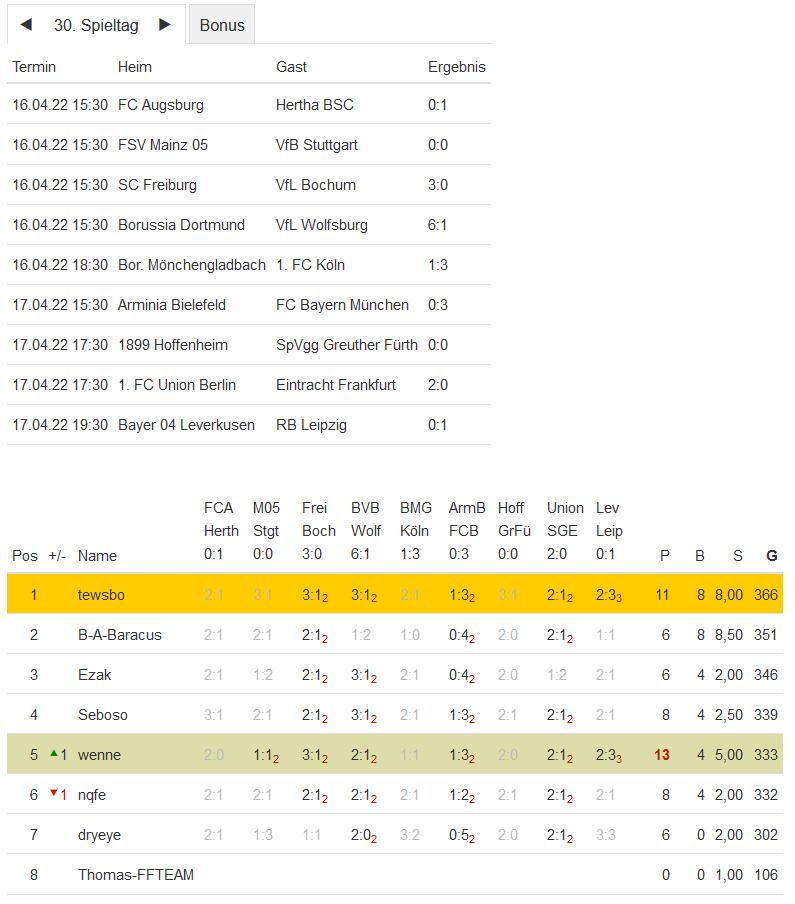Stand 30. Spieltag - NI-Tippspiel zur Fussball-Bundesligasaison 2021/22