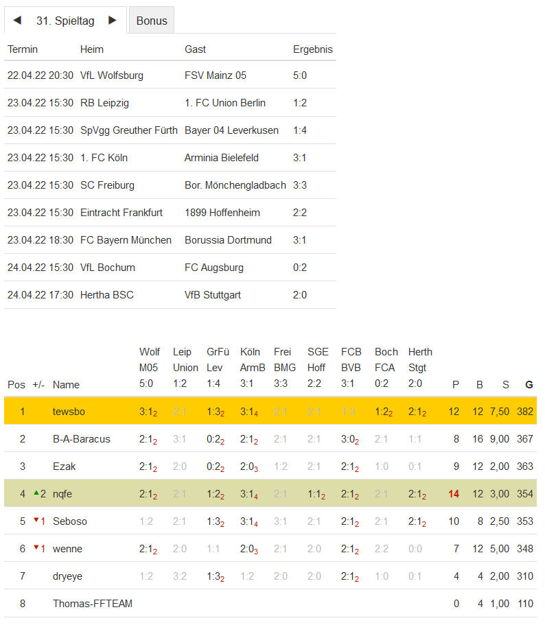 Stand 31. Spieltag - NI-Tippspiel zur Fussball-Bundesligasaison 2021/22