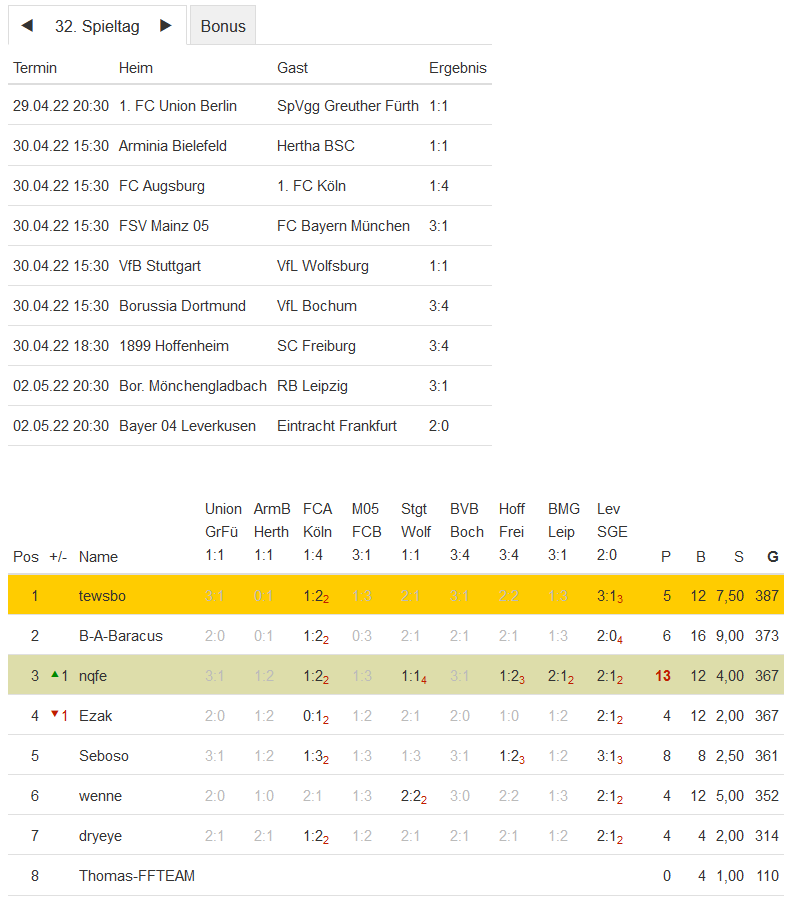 Stand 32. Spieltag - NI-Tippspiel zur Fussball-Bundesligasaison 2021/22