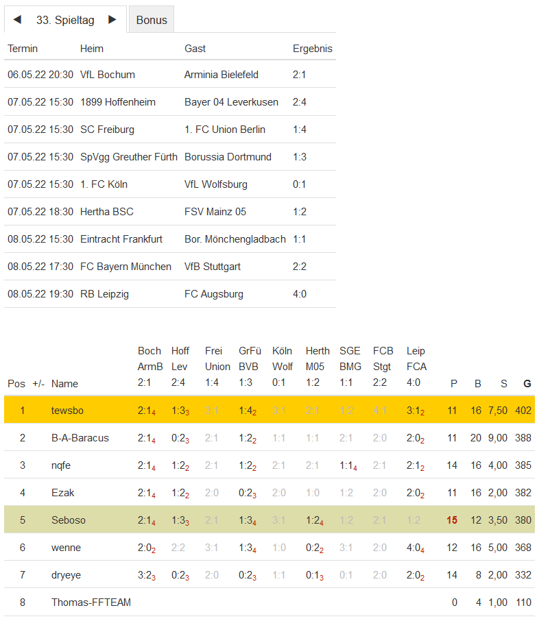 Stand 33. Spieltag - NI-Tippspiel zur Fussball-Bundesligasaison 2021/22