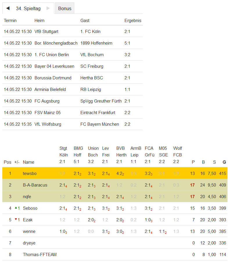 Endstand nach dem 34. Spieltag - NI-Tippspiel zur Fussball-Bundesligasaison 2021/22