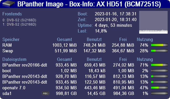 Ich habe aber keine HD51 daher weis ich nicht wie das dort lief. Ich bin daher keinen mm schlauer geworden.BPanther hat geschrieben: ↑Fr 20. Jan 2023, 17:21 Was gibt es denn da nicht zu verstehen beim Multiboot? Alles läuft wie sonst auch, nur eben jedes Image in einzelnen Partitionen statt in einer großen - eben so wie es Anfangs auch bei der HD51 war bis der neue BOLT kam. Wer also Notboot will/braucht, der benutzt einmalig die disk.img damit separate Partitionen angelegt werden und gut ist. Ansonsten gibts halt keinen Notstart. Für den Benutzer oder die Images macht es keinen Unterschied, da es eben nur den Notstart betrifft. Aber alles wie gesagt bereits von der HD51 bekannt.