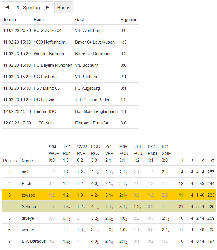 Stand 20. Spieltag - NI-Tippspiel zur Fussball-Bundesligasaison 2022/23