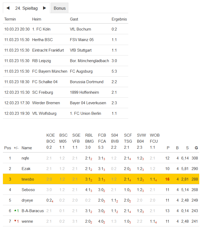 Stand 24. Spieltag - NI-Tippspiel zur Fussball-Bundesligasaison 2022/23