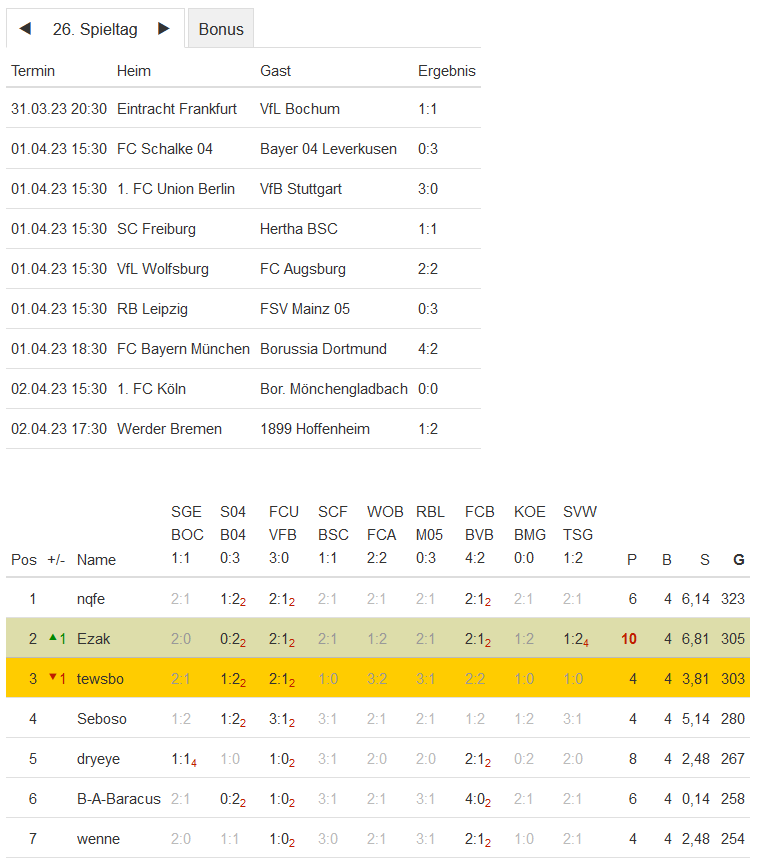 Stand 26. Spieltag - NI-Tippspiel zur Fussball-Bundesligasaison 2022/23