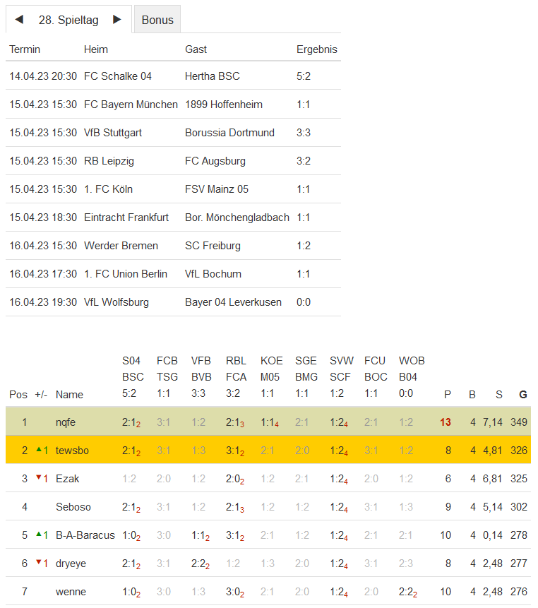 Stand 28. Spieltag - NI-Tippspiel zur Fussball-Bundesligasaison 2022/23