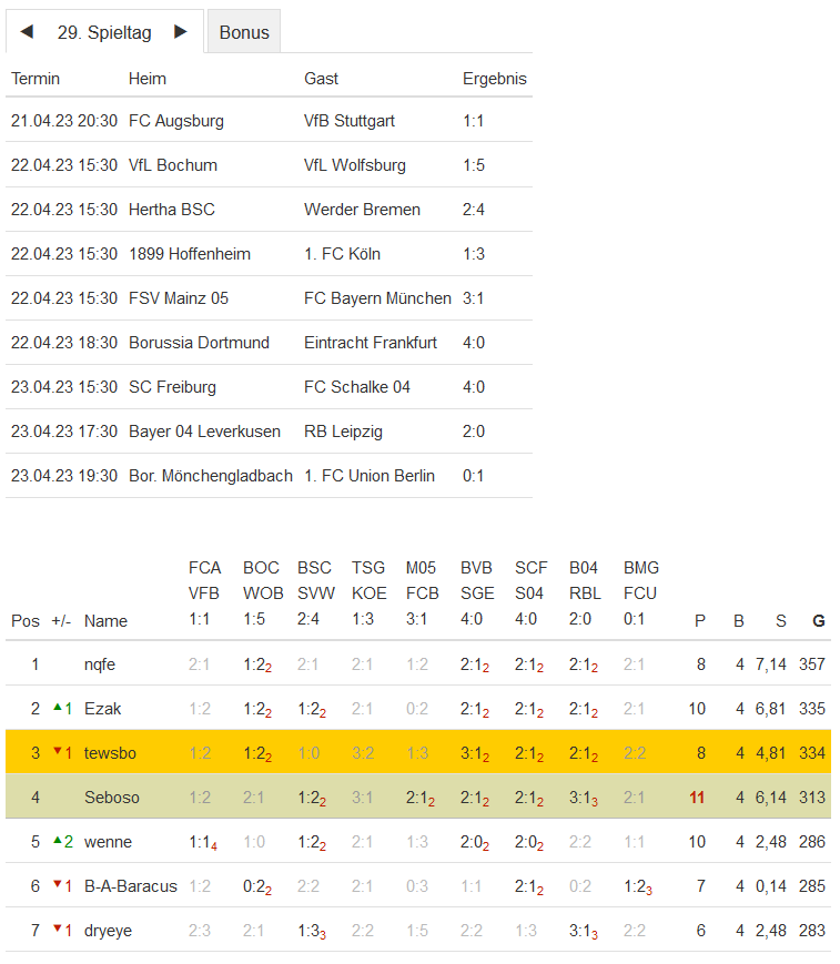 Stand 29. Spieltag - NI-Tippspiel zur Fussball-Bundesligasaison 2022/23