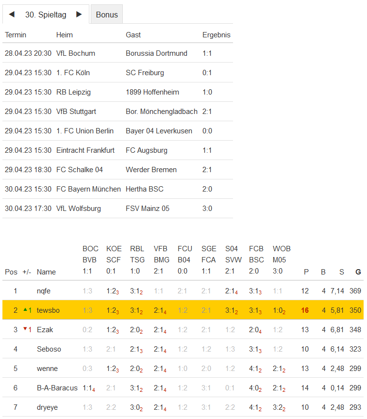 Stand 30. Spieltag - NI-Tippspiel zur Fussball-Bundesligasaison 2022/23