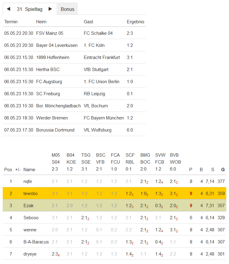 Stand 31. Spieltag - NI-Tippspiel zur Fussball-Bundesligasaison 2022/23