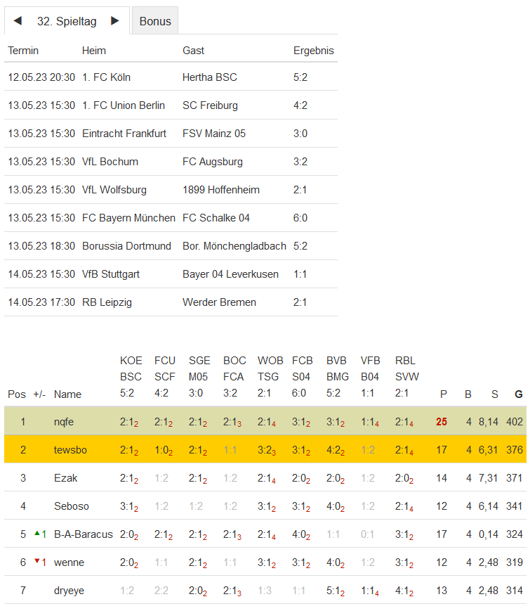 Stand 32. Spieltag - NI-Tippspiel zur Fussball-Bundesligasaison 2022/23