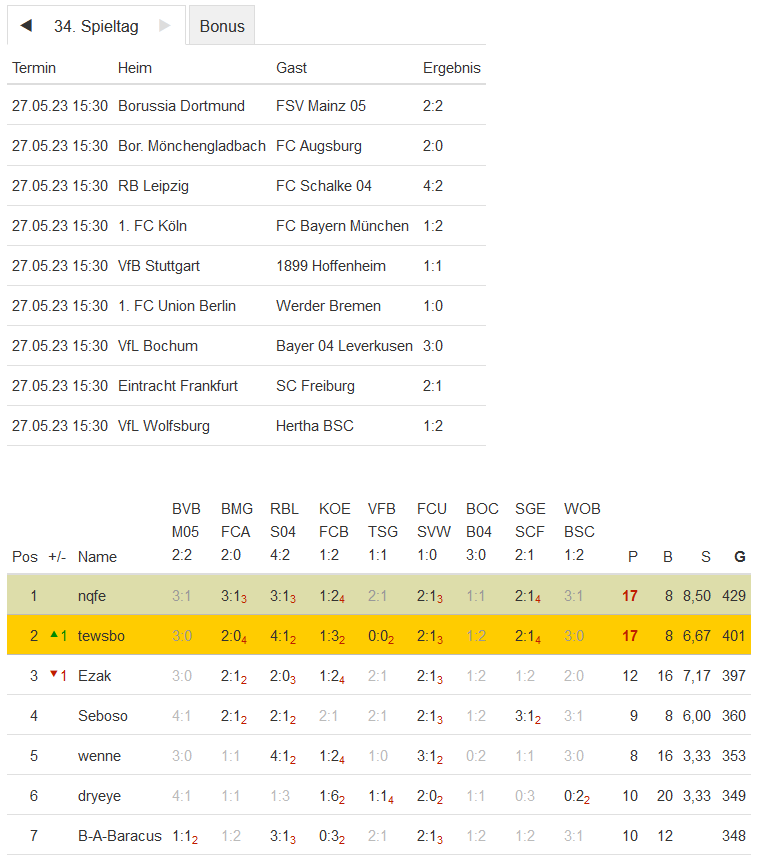 Endstand: 34. Spieltag - NI-Tippspiel zur Fussball-Bundesligasaison 2022/23