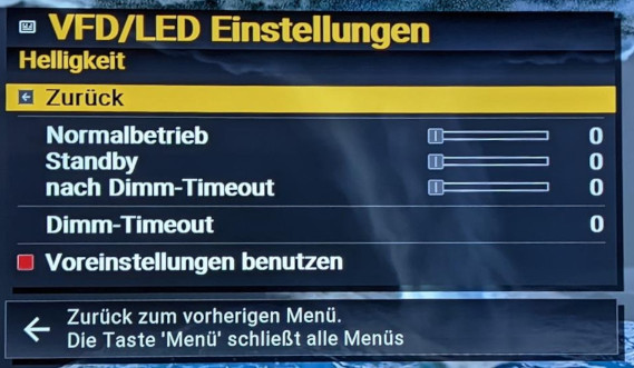 Eine Sache ist mir nun aufgefallen: Wenn sich die Box im Deep-Standby befindet, möchte ich das VFD/LED ausgeschaltet haben. Ich habe hier geschaut, allerdings sind hier nur die Optionen für Normal- bzw.Standbybetrieb: Dadurch bleibt das VFD im Deep-Standby an und hat auch den kuriosen Effekt, dass, wenn ich im Energieverbrauch "verzögertes Auschalten" aktiviere: das Display im normalen Standby erst aus ist und nach dem Übergang in den Deep-Standby wieder leuchtet.