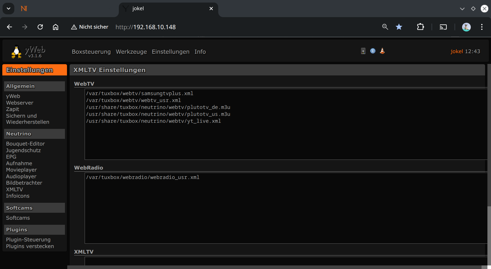 was mich seit einiger Zeit nervt, ich muss bei jedem Start der Box die WebTV Senderliste per Hand aktualisieren, weil sonst nur einige Senderlisten eingelesen werden. Ich habe ca. 10 Senderlisten und 2-3 werden dann beim normalen Start nicht erkannt. Ich habe schon Senderlisten wie Samsung, Pluto, Rakuten, YouTube ganz herausgeworfen, das behebt das Problem dann zeitweise. Werfe ich andere auch noch mit raus funktioniert es wieder. Es liegt also nicht an den Senderlisten selbst, sondern nur an der Anzahl (/Größe?).