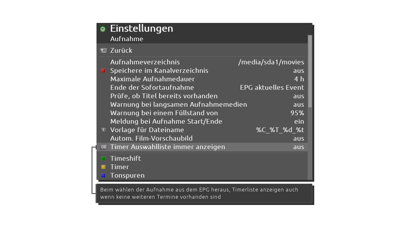 - Recording Menu: Add option "Always show timer pick list" - "when choosing recording from EPG, view Timer list even no further entries found" yes/no