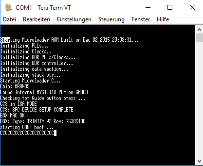 Hallo ich bin neu hier und habe meine neue Trinity Duo gegrillt beim Image flashen. Die Wiederherstellung klappt auch nicht. Komme zwar zurecht mit der Anleitung funktioniert auch alles bis zum Neustart der Box nach Jumper Entfernung, den sie startet nicht von USB. Noch ein Problem auf dem Gehäuse steht Duo und im Startlog steht v2 was ist nun richtig. Ich habe mal die Bilder vom Teraterm angehängt, vll kann ja jemand helfen.