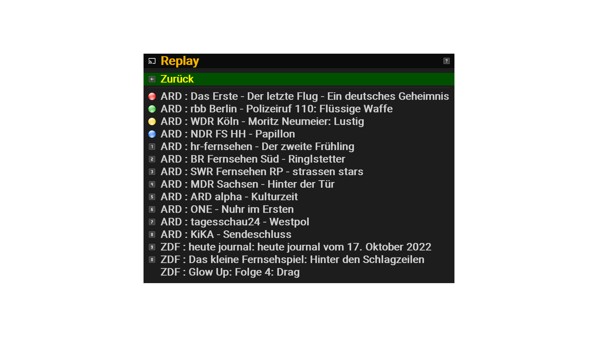 Und hast Du mal probiert ob man den (ÖR) Sender den man gerade eingeschaltet hat nicht anhand der Sender ID auswerten um dann direkt diesen von Filmanfang starten zu können. Dann ginge das nämlich mit einem Tastendruck wie beim "Original" HbbTV replay. (Ich nutze die << Taste zum Aufruf des Plugins)