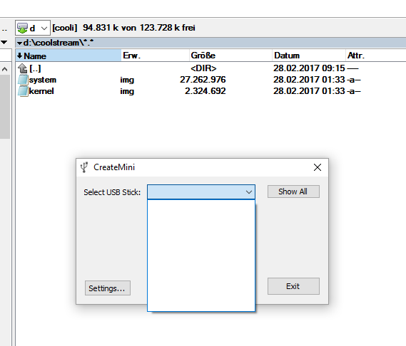 Was auch komisch ist warum wohl Create Mini bei mir nicht geht siehe oben. Kann sein dass ich damit den Stick endlich so formatieren könnte dass es endlich tut auch ohne serielle Schnittstelle.