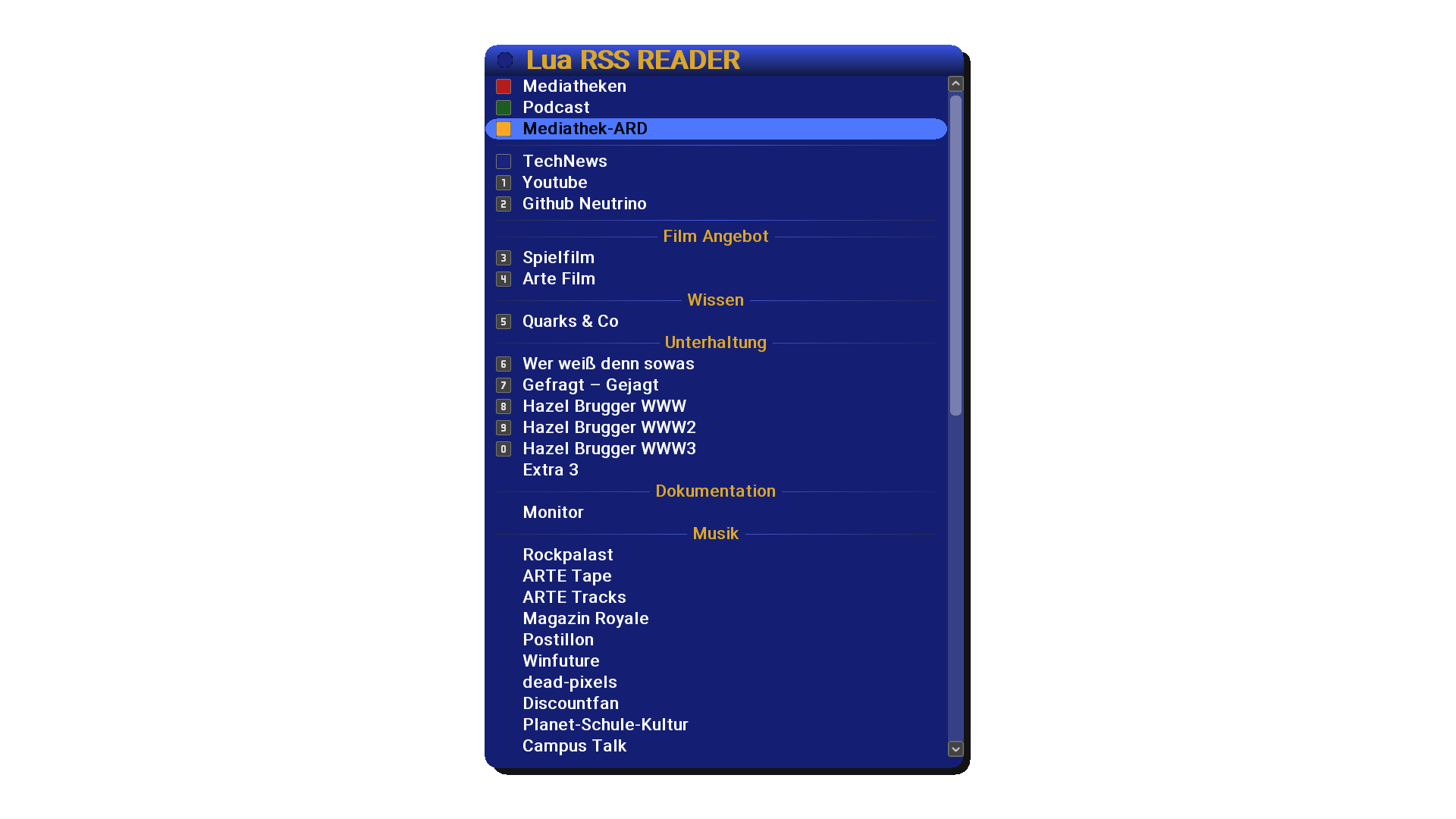 Ich habe mal meine rssreader.conf aufgeräumt sehr viele funktionierte ja leider nicht mehr (vor allem aus der ARD Mediathek)
