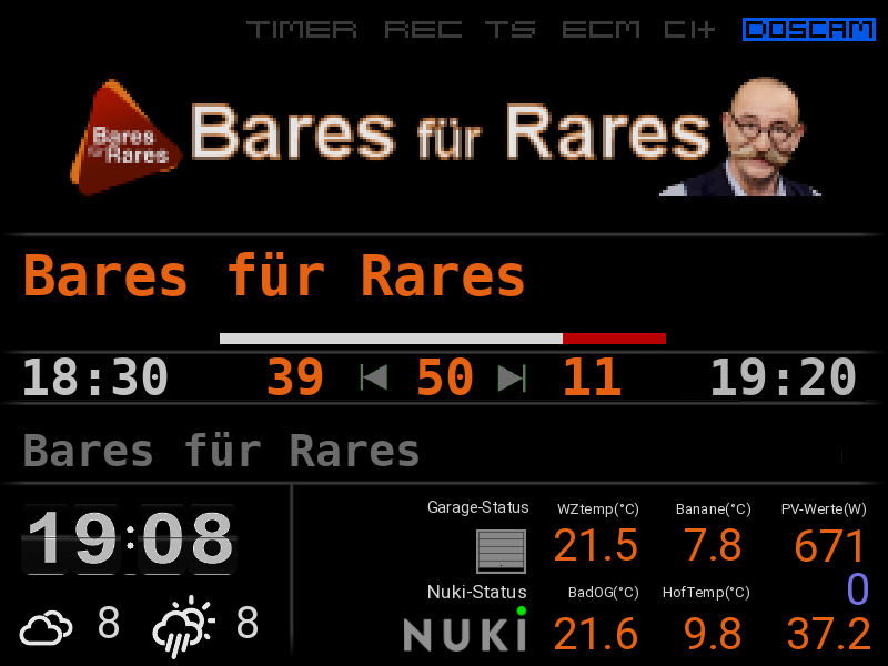 Habe allerdings noch Platz freigeschsufelt beim 800x600 spf für ein paar Anzeigen vom smarthome. U.a. Daten von der Photovoltaik (Stromverbrauch, PV Leistung, Batterie stand, das lasse ich mir aber auch auf der infobar.txt anzeigen), einn paar temp Sensoren. Habe im smarthome weit über hundert Aktoren, die ich auswerten und anzeigen könnte. Mal sehen was es final aufs Display schafft.