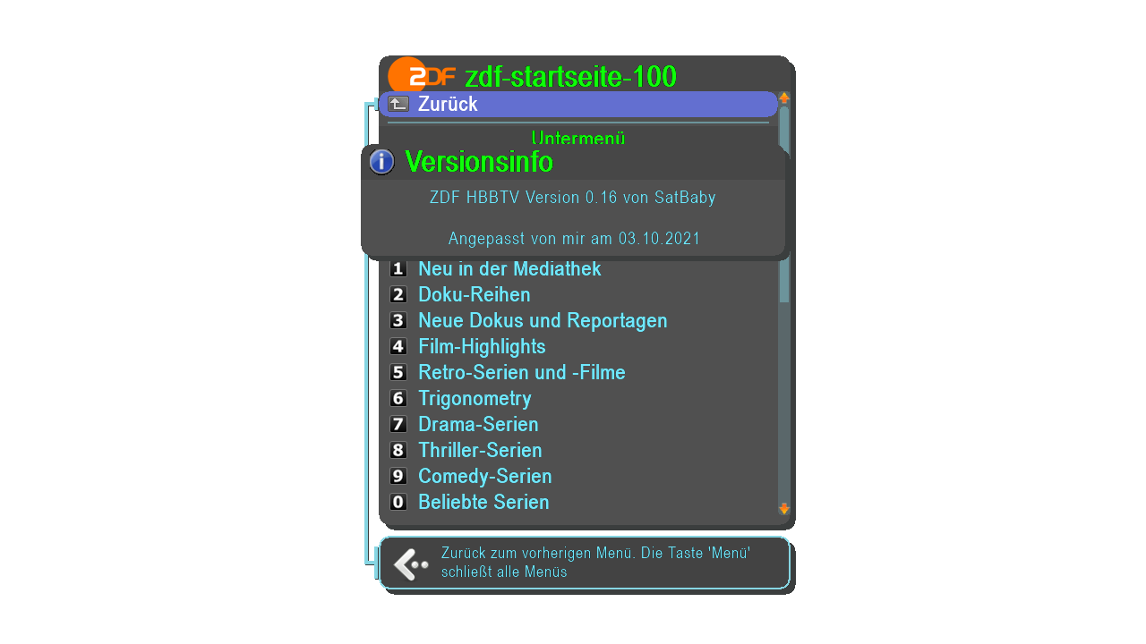 info('Version ' .. Version .. ' von satbaby\nZuletzt modifiziert\n' .. mdate,'ZDF HbbTV Versionsinfo')nochmals vielen dank