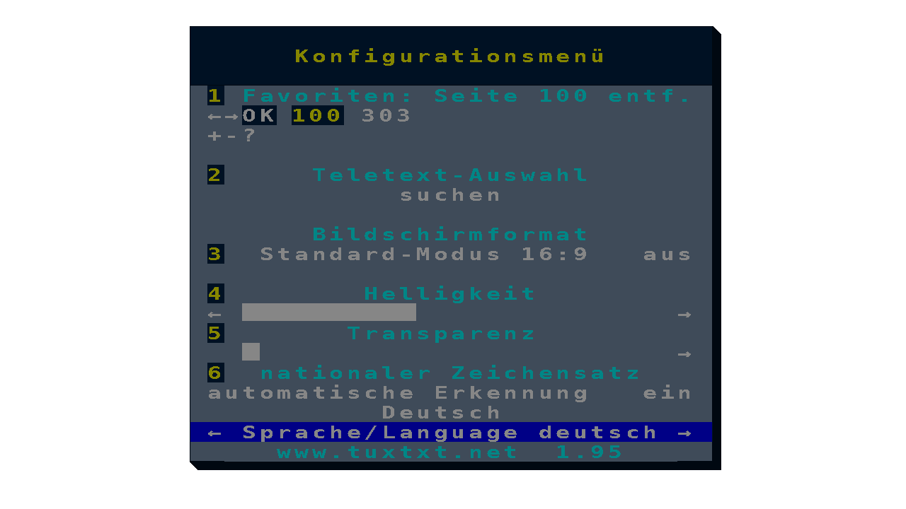 Im zweiten Anlauf wieder ZDF-HD gewählt: da ging es bis zum ersten Absturz ganz schnell, nun zum 2ten Anlauf mit mitloggen konnte ich das Menü im Videotext mehrfach auf und zu machen. Und hat sich verhalten wie schon geschrieben = die Einstell-Zeilen tauchen mit rauf/runter scrollen auf, die "Titel" zum Menü (also wie Brightness, Transparency, Language) fehlen, aber wenn man Brightnes/Transparency ändert, dann wird das komplette Menü dargestellt -und das ganze, bis die Box mit 139 endet