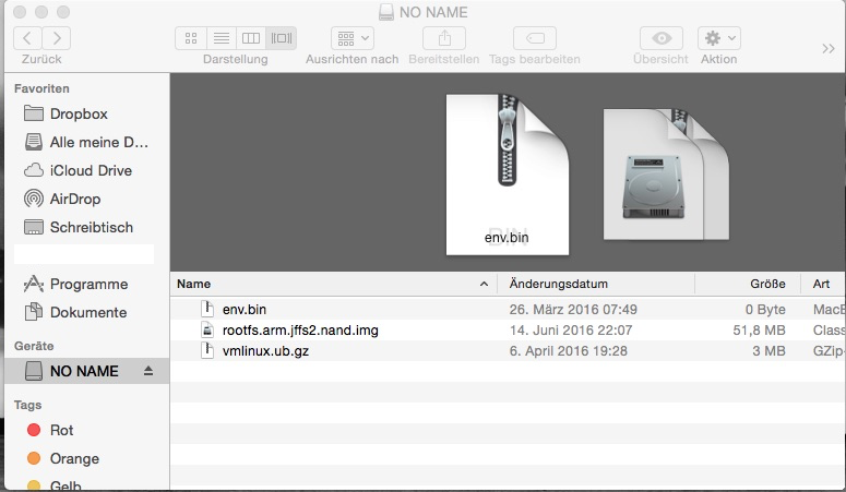 Na ja, jetzt steht es ja schon fast richtig da nachdem Du korrigiert hast. Und in der Anleitung steht auch ganz sicher, dass das als rootfs.arm.jffs2.nand.img umbenannt werden soll?Tommfred hat geschrieben:Drei Dateien