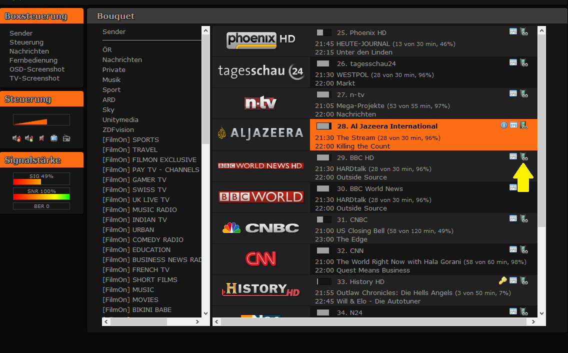 Man klickt unter Boxsteuerung auf Sender, wählt das Bouquet aus und kann dann mit Klick auf das Stream-Icon (das letzte Icon hinter dem Sendernamen) den Stream aufrufen.