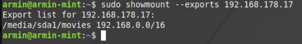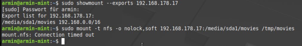 mount: mounting 192.168.178.17:/media/sda1/movies on /mnt/movies failed: Connection timed out