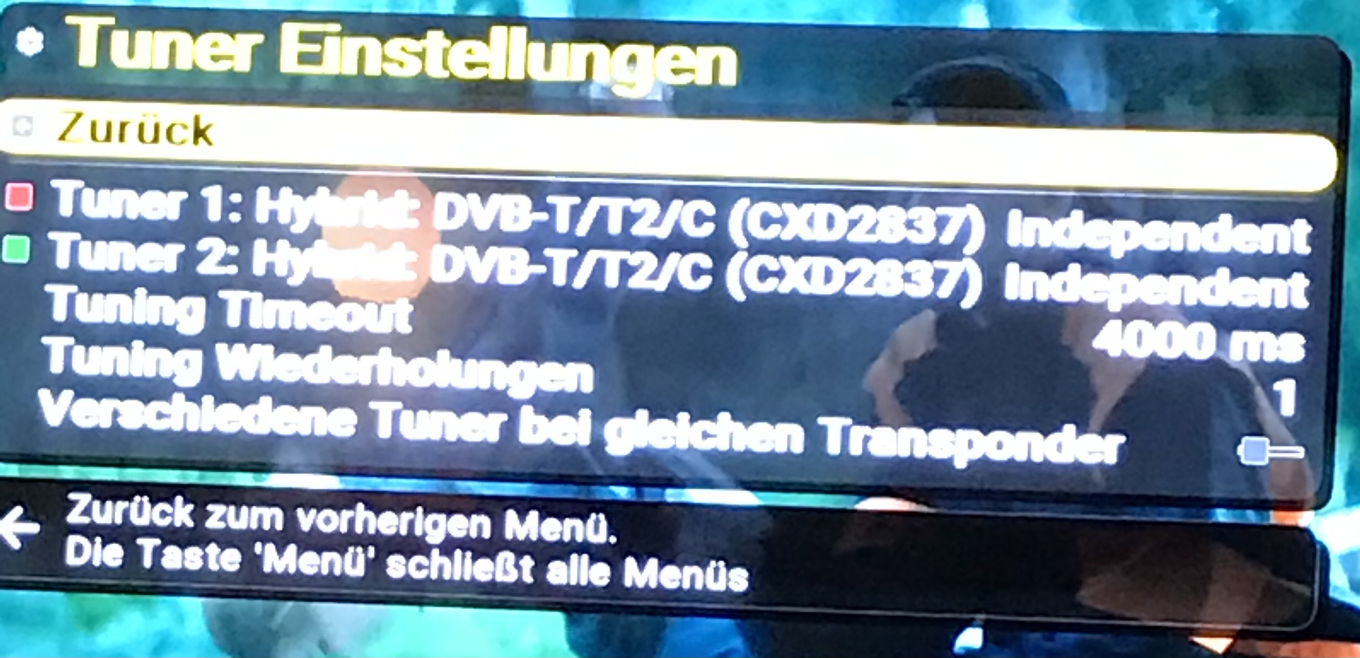Das ist ja das. Tuner2 nimmt auf. Ich kann während der Aufnahme auch hinschalten und Tuner2 wird angezeigt. Diesen Sender kann ich dann aber meist nicht mehr mit Tuner1 nach der Aufnahme schauen. Nur noch über Tuner2 wenn ich kurz den Tuner1 deaktiviere.