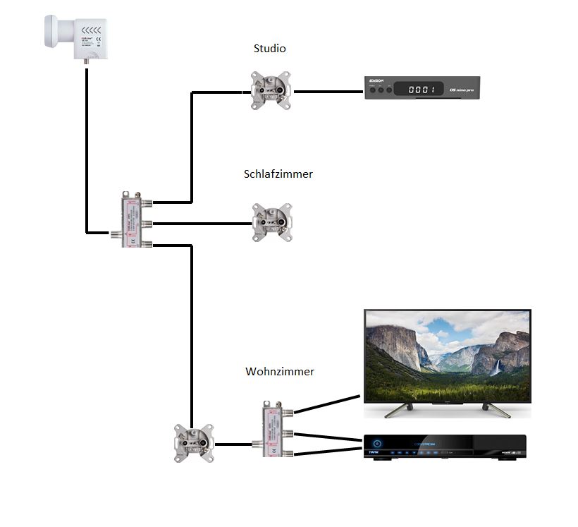 Den Test am ersten Splitter mach ich morgen. Aber wie würdest Du kabeln? Vom Splitter in die Tuner der Cooli und in den neuen Receiver? Oder stört die Dose? Ich könnte auch den ersten Splitter rausmachen und den neuen Receiver neben der Cooli am unteren Splitter anschließen. Sollte doch das selbe sein. (Hab am ersten Splitter keinen Fernseher...)