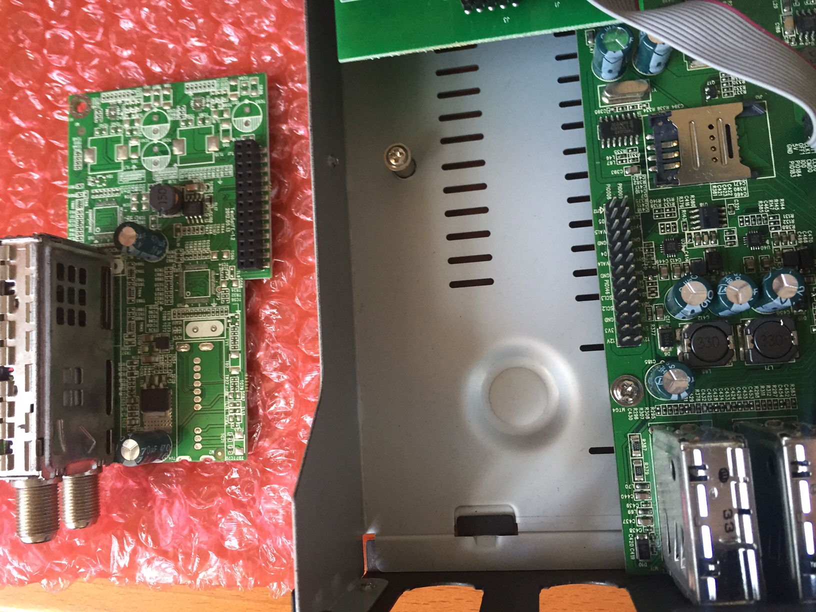Irgendwie ist da die Steckleiste am DVB-C-Tuner falsch. Sollte die nicht nach unten schauen?