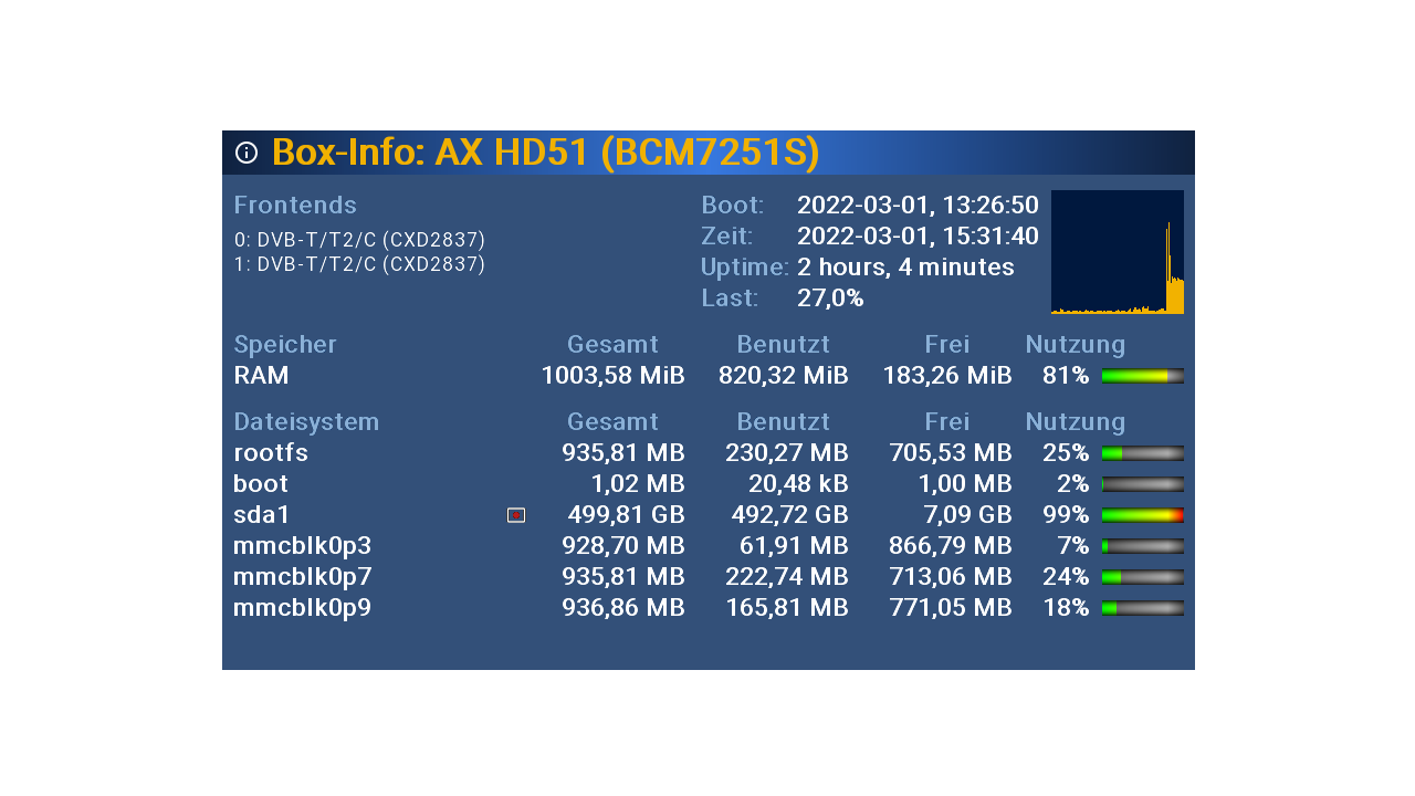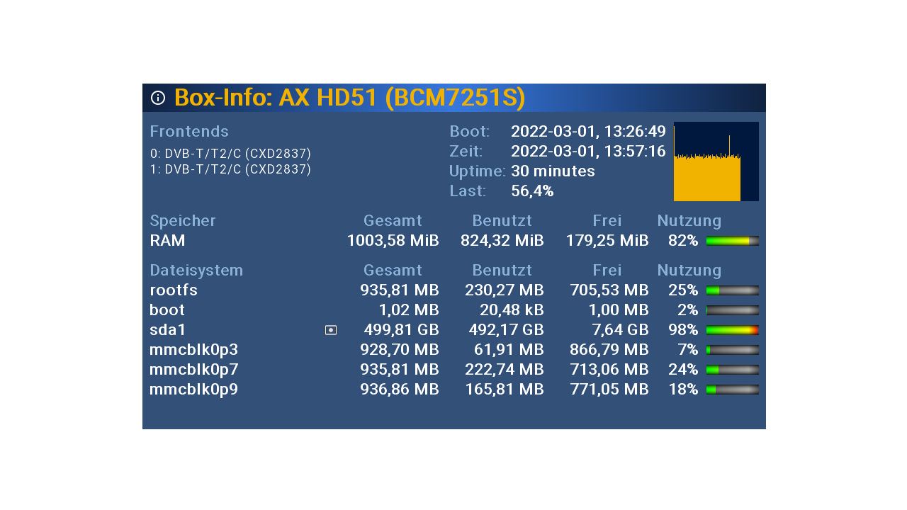 Hallo , habe in der letzten Zeit mehrere Nightly-Images in meine HD51 geflasht und festgestellt das die Last in der Box-Info sehr hoch wurde , im Moment bei über 56 % , im Image vorher bei 33 % , siehe Screenshot ...