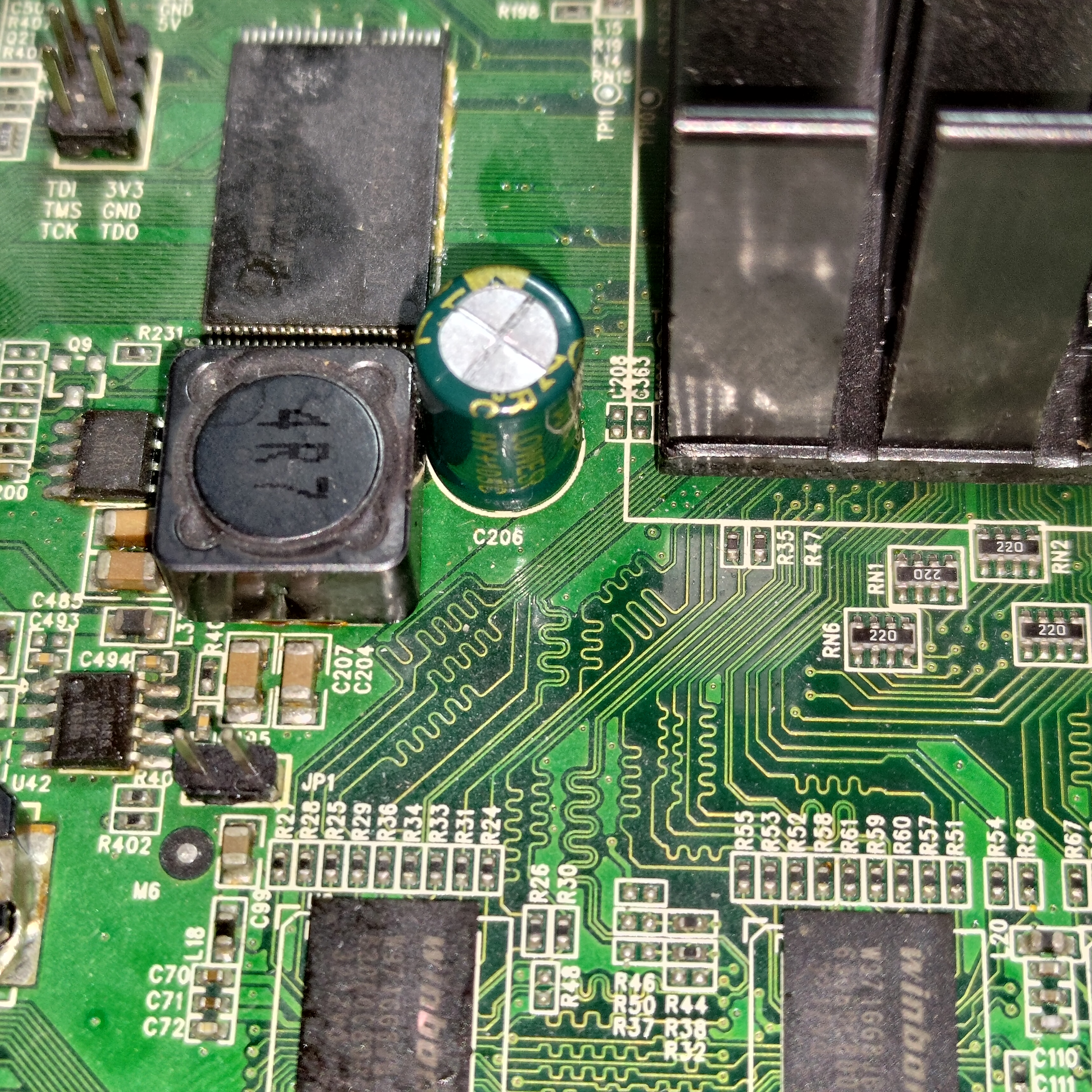 Also Box geöffnet und nach offensichtlichen Fehlern geschaut. Neben der CPU war ein Kondensator (C206) nicht aufgebläht, aber so ganz taufrisch sah er eben auch nicht mehr aus. Die spezifizierten 470 µF waren nur noch 380 µF.