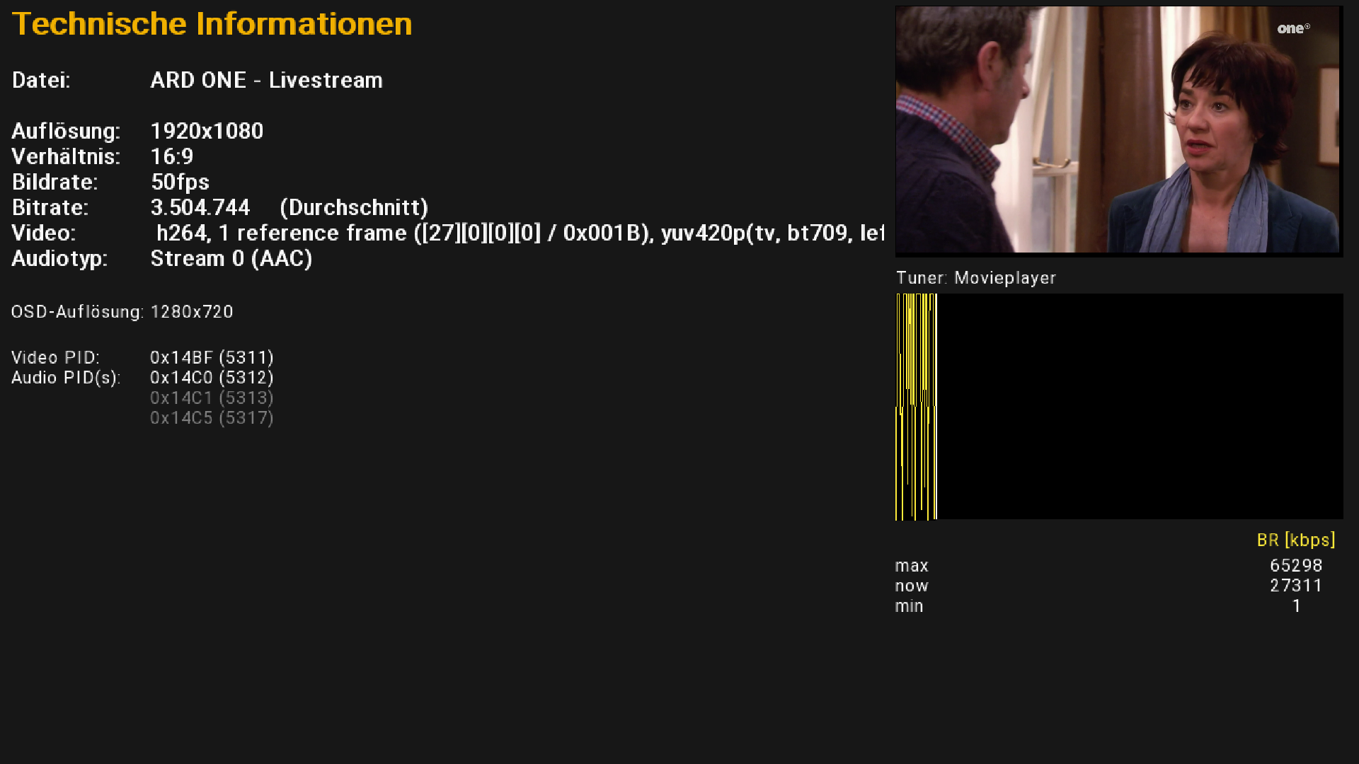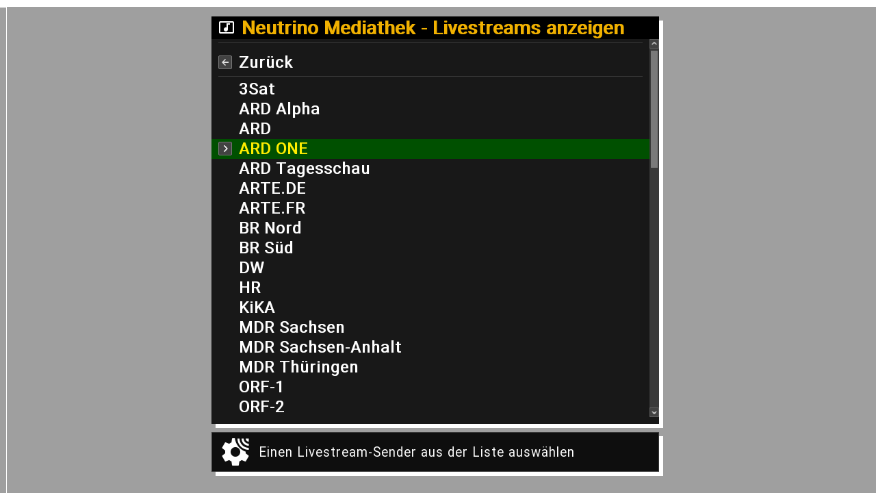 <webtv title="ONE" xmltv="/tmp/epg.xml" epgmap="One.de" url="https://mcdn-one.ard.de/ardone/hls/master.m3u8" script="" logo="/usr/share/tuxbox/neutrino/icons/logo/.png" genre="ARD/ZDF" description="Livestream" />